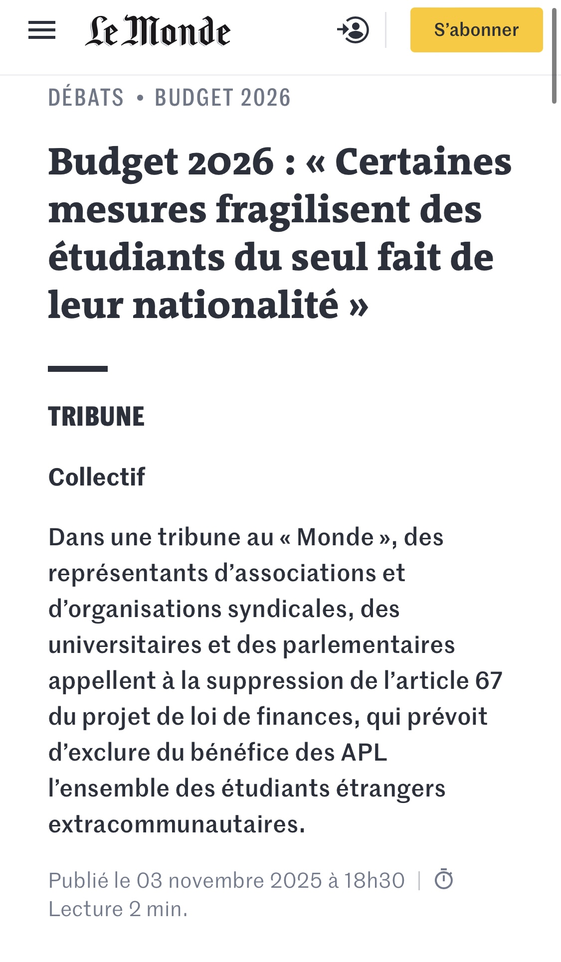 프랑스에서 생활하려면 지역에 따라 물가가 다르지만기본적으로 유로 환율 1600원,대도시라면 월세 기본 550€~생활비 아껴서 2-400€학비(ecole public기준) 6-700€교통비 + α그나마 월세 보조금이 있어서월세는 실질적으로 100-300€정도 개인부담이었다.그러나.. 두둥..내년 2026월 7월부터 비EU국가 외국인 학생은APL가 삭제될 것이라는 내용이다.이 법안이 통과된다면다른 지원들도 줄어드는것과외국인 신입생 정원이 줄어드는 것도 시간문제다.학비가 저렴하고 학생 복지 혜택이 좋은프랑스라는 메리트가 사라지면프랑스 유학도 점점 줄어들 듯 하다…출처Lemondehttps://www.lemonde.fr/idees/article/2025/11/03/budget-2026-certaines-mesu..